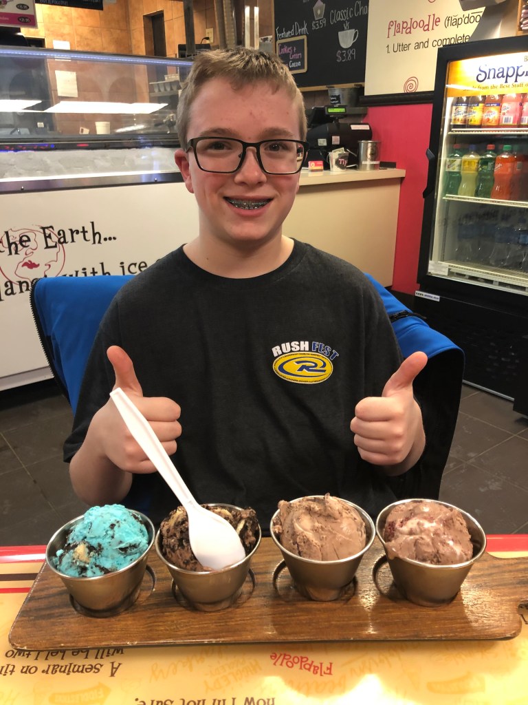 For creativity and uniqueness Flapdoodles has 24 different flavors of ice cream available each day. My family ordered 2 flights, which is 4 scoops of ice cream per flight. We actually sampled 6 unique flavors, because we doubled up on some of the flavors. I have been to Flapdoodles many times and only had 2 of those flavors. For uniqueness Flapdoodles is like no place I have ever been, with every part of it being unique from the funny and chill atmosphere to the 24 different flavors of ice cream. They also had a few dairy free options. Because of that, I give creativity and uniqueness 4 stars. The price of our meal cost $20, we were all filled to the brim. I give the price 4 stars. That gives Flapdoodles a total of 17 stars.